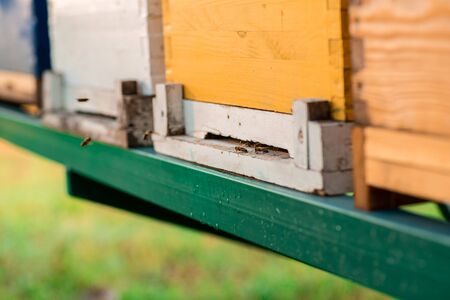 Bee apiary bee hive for harvesting honey, Beekeeper beehive with bees flying to the landing boards. Apiculture