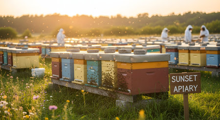 A vibrant 'Sunset Apiary' with rows of colorful beehives in a grassy field at sunset. Bees are swarming around the hives, and beekeepers in protective suits are working in the background, tending to the bees.
