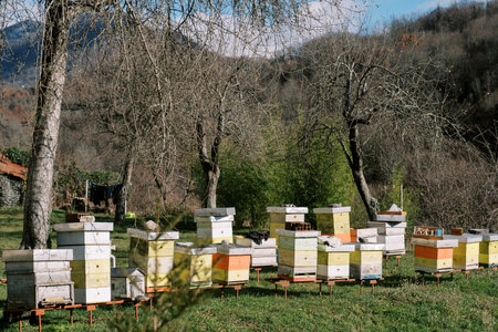 Colorful beehives in an apiary among the trees at the foot of the mountains