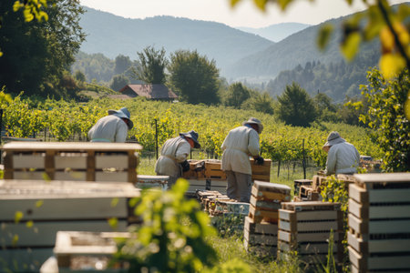 Beekeepers wearing protective clothing working on a sunny apiary in the countryside, surrounded by mountains