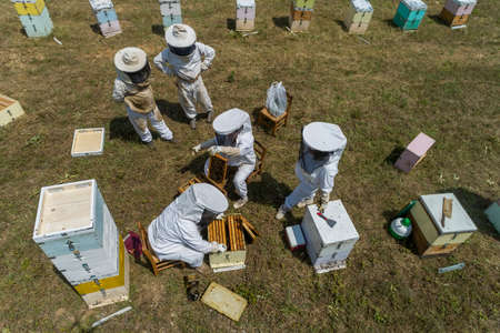 Beekeepers on apiary. Beekeepers are working with bees and beehives on the apiary.