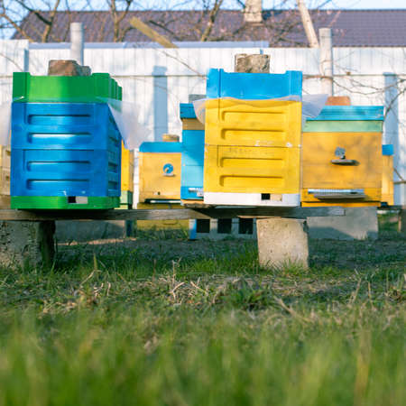 Colorful wooden and plastic hives against blue sky in summer. Apiary standing in yard on grass. Cold weather and bee sitting in hive.