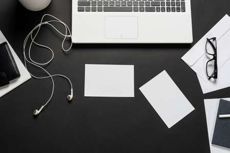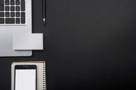 Top view flat lay of business working place. Empty workspace on table. Black minimalism.