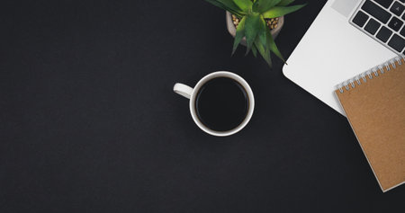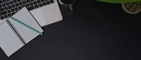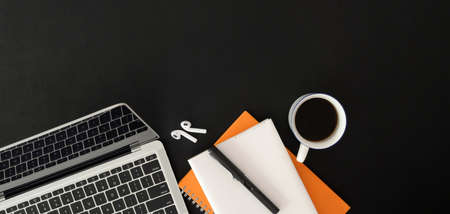Top view above of Black office desk table with laptop, notebook and coffee cup with equipment other office supplies. Business and finance concept. Workplace, Flat lay with blank copy space.