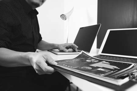 businessman working with smart phone and digital tablet and laptop computer and document in modern office,black and white