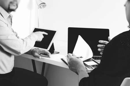 two colleague web designer discussing data and digital tablet and computer laptop with smart phone and design diagram on marble desk as concept, black white