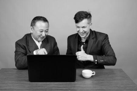 Mature Asian businessman and young Scandinavian businessman against gray background