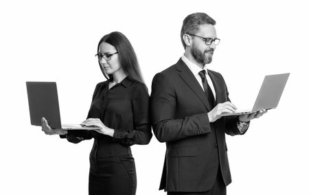 businesspeople isolated on white. freelancer working online. boss and employee has online. businesspeople in formalwear with laptop in office. Remote online working. Business success. Customer base