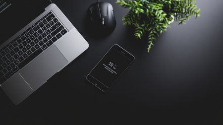 A stylish workspace featuring a laptop, a smartphone showing a battery charge, a wireless mouse, and a green plant on a black desk surface, perfect for modern digital professionals.