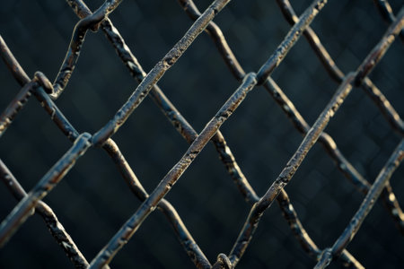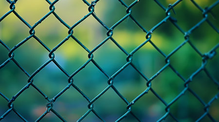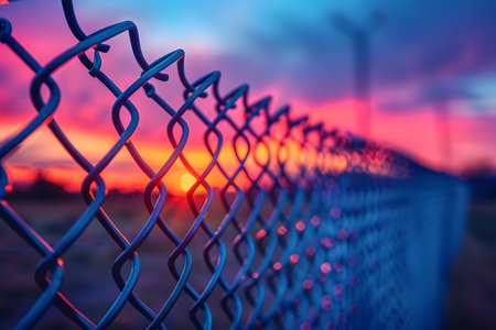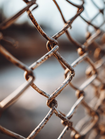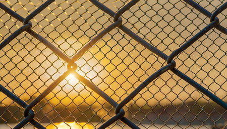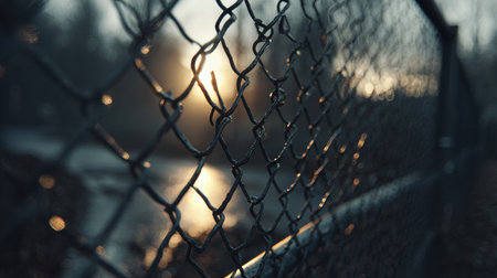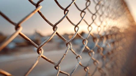 Close up view of chain link fence with sunlight shining through, creating warm and inviting atmosphere. intricate details of metal links are highlighted against soft glow of sunset