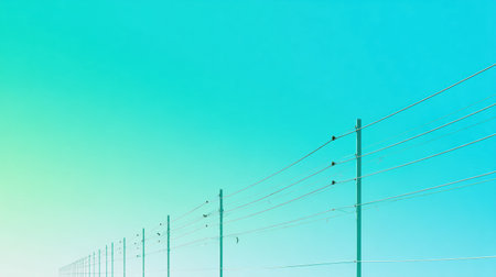 In a tranquil midday setting, electric poles and wires extend toward the horizon, adorned with birds perched atop them against a colorful sky.