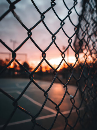 Dusk settles over a basketball court, with shadows created by a chain link fence framing a vibrant sunset in a peaceful neighborhood.