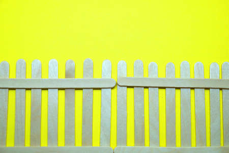 wooden ice cream sticks imitating a fence on a yellow background blank, copy space