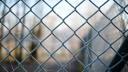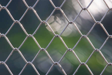 Closeup of a metal mesh fence with blurred out bokeh background