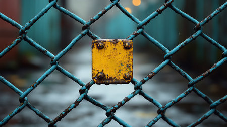 Close-up of a weathered blue chain-link fence with a yellow metal plate secured by rusty bolts. The background is blurred, suggesting an urban or industrial setting.