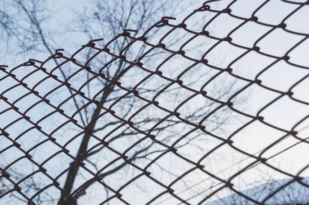Metal chain link fence closeup. Selective focus. Toned.