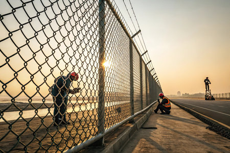 Medium shot of electronic perimeter fence featuring integrated alarm sensors to detect unauthorized access at airport boundaries for enhanced security measures.