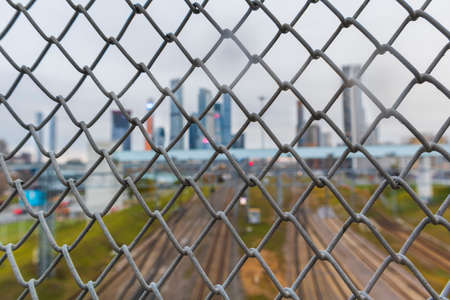 A beautiful view of the skyscrapers in the city through the metal fence during sunset