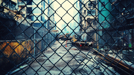 This image captures a construction site framed by a chain-link fence, featuring safety cones against a backdrop of a bustling city skyline and overcast sky.