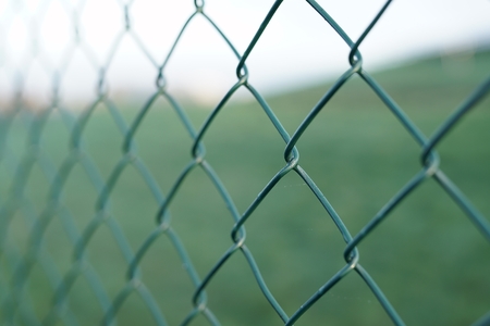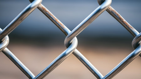 Close-up texture of steel chain-link fence with blurred background, representing security and restriction