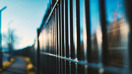 Closeup of a metal fence on the street in the evening.