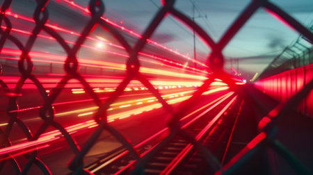 A blur of red and white lights can be seen through the chainlink fence signaling the security and activity of the airport gates