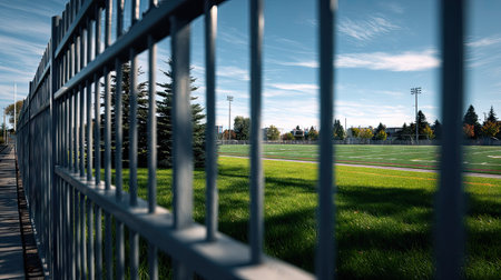 The view through a modern metal fence, capturing the expansive football field beyond, with clear skies and no one around