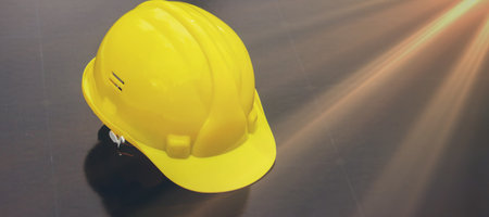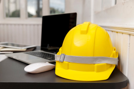 A yellow hard hat sits beside a laptop with a blank screen on a desk, suggesting a blend of technology and construction or engineering. Close up of helmet and etc. on architect desk.
