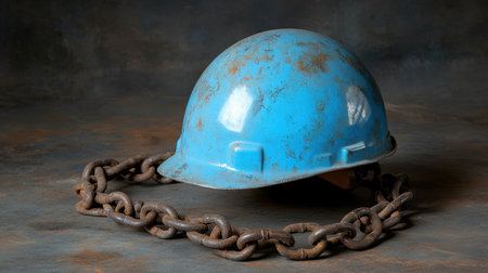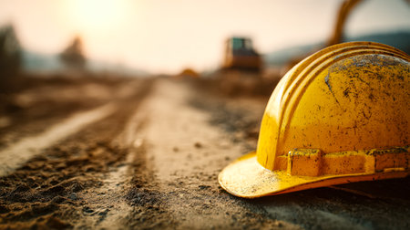 A safety helmet sits atop a rugged dirt path, illuminated by the warm glow of sunset, evoking themes of hard work, endurance, and the day's end.