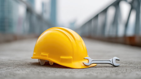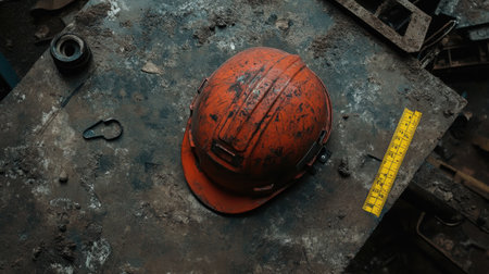 A bright orange hard hat rests on a smooth industrial surface, emphasizing safety and protection in the construction environment. Ideal for design and industry themes.