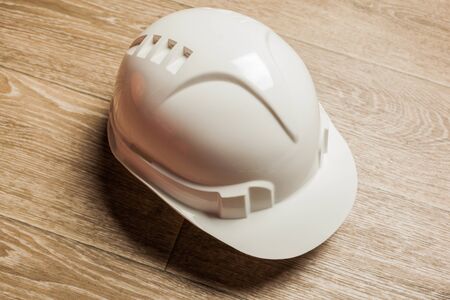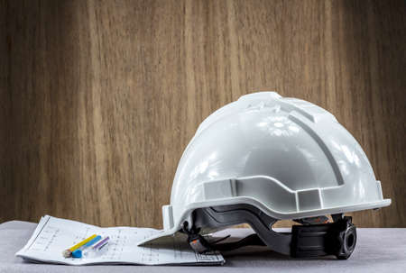white safety helmet on desk at construction site with construction tools and scaffold background, industry and construction concept