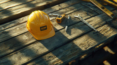 Safety helmet, hard hat with yellow color on the wooden table and mechanic tools alongside