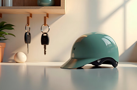 White, shiny motorcycle helmet on boss table in office. Big boys toys. Hobby. Ai generative