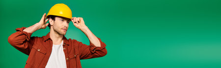 A handsome male worker in uniform poses with a yellow hard hat on a green backdrop.