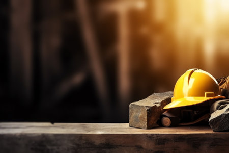 A safety helmet paired with protective glasses rests on rough concrete, illuminated by the gentle glow of early morning light, highlighting the importance of safety proto