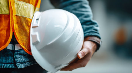 A focused laborer in a bright orange vest and casual denim shirt, clutching a protective helmet amidst an active construction environment, emphasizing safety and supervision.