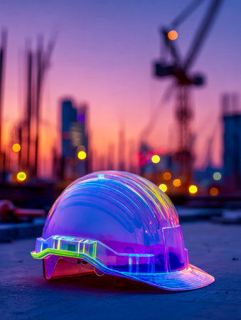 A solitary white helmet lies abandoned on rough concrete, with a vibrant cityscape and fading sunset behind, capturing the conclusion of a busy building day.