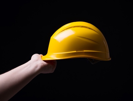 Work safety concept. Yellow safey hard hat held by a male hand on a white background. Labor Day concept.
