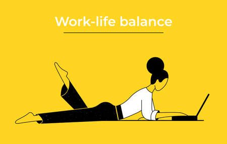 A woman is lying on the floor with a laptop and is working, studying. Bright yellow background. Linear style.
