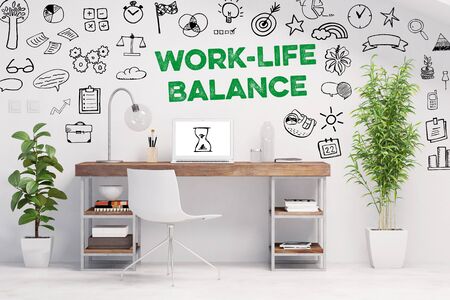 Work-Life-Balance als Business Konzept im Büro an der Wand über einem Schreibtisch