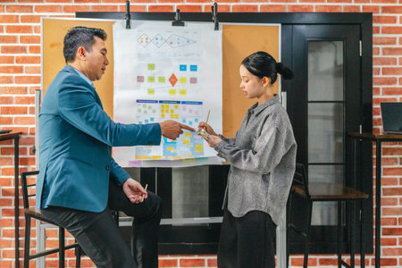 Two professionals engage in a focused brainstorming session, using planning tools and discussion to develop new ideas in a stylish, collaborative office setting.