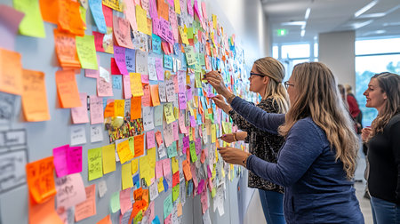 A group of women are working on a large board with colorful sticky notes. They are collaborating on ideas and concepts, and the mood of the image is one of teamwork and creativity