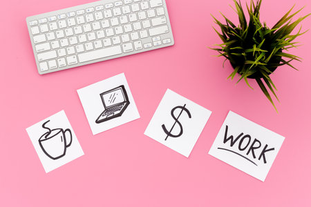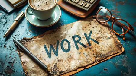 WORK Text of business office on wooden cubes in front of office desk with office tools