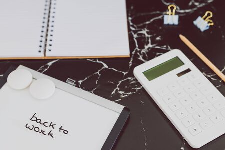 Top view of trendy workplace with notebook, laptop computer and office supplies on black table background