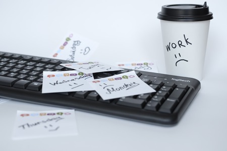 on the black keyboard many stickers with the names of the days of the week. next to a paper Cup of coffee with the inscription.