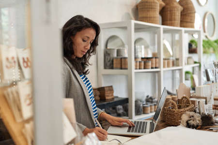 Manager preparing store for opening, arranging stylish clothes for customers in modern boutique. Shopping centre employee checking fashionable merchandise, working with trendy items