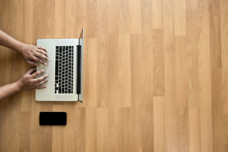 Top view man used of laptop hands on a wooden desktop and copy space