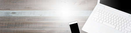 Design of standard horizontal web banners with space for text - Top view Computers and Mobile on wooden table background