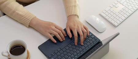 Top view of female hands working with laptop on office desk with smartphone, tablet and office supplies