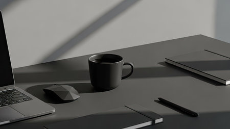 A close-up view depicts a workspace with a laptop, coffee mug, and stationery items arranged on a gray desk. The monochromatic color scheme highlights the objects' textures and shapes. The scene is illuminated by soft, natural light, suggesting an indoor setting. This image could be used for various commercial projects related to work and design.